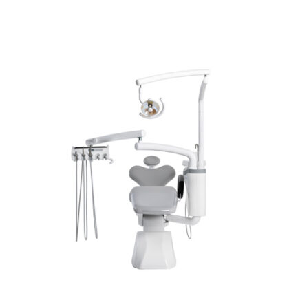 Przy bloku spluwaczki mamy zamontowany zbiornik na wodę destylowaną a w przypadku odpowiedniej konfiguracji unitu możemy zamontować separator cieczy. Misa spluwaczki jest zintegrowana z blokiem, blok możemy odchylać od fotela umożliwiając dostęp do pacjenta od lewej strony. Przy bloku spluwaczki możemy zamontować panel asysty. Na panelu mamy zainstalowany ślinociąg wodny lub powietrzny (do wyboru przez lekarza) oraz możliwość zamontowania rękawów ssących, dodatkowej dmuchawki bądź toru pneumatycznego. Lampa zabiegowa może posiadać halogenowe lub diodowe źródło światła w wersji autorskiej Chiromegi, firmy GComm lub Faro. Na maszcie jest możliwość zamontowania monitora lub dodatkowej tacki. Panel lekarza zawieszony jest na przegubowym ramieniu. Można w unicie zastosować ramię pantograficzne z hamulcem. Sterowanie wszystkimi funkcjami unitu realizujemy poprzez klawiaturę membranową na panelu lekarza. Panel może być wyposażony w pięć lub sześć rękawów podawanych od dołu lub od góry. Ich konfiguracja jest zależna od potrzeb lekarza i ustaleń podczas składania zamówienia, podstawą są dwa aktywne tory robocze. Odciągi wyposażone są w blokady ruchu, rękawy pneumatyczne standardowo przygotowane są do końcówek z podświetlaniem, regulację sprayu możemy realizować mechanicznie.